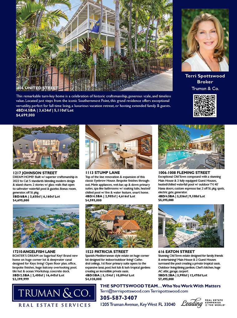 Key West’s preeminent real estate professional, Terri Spottswood and her team have been setting new records each year and have consistently earned the “Top Producer” Award for several years. Nationally recognized, Terri has also achieved the most distinguished awards of “Chariman’s Circle” and “Legend.” She and her associates continue to break new ground by providing top rated services.